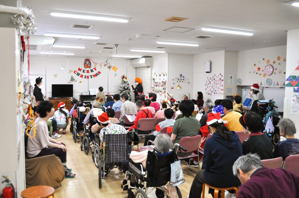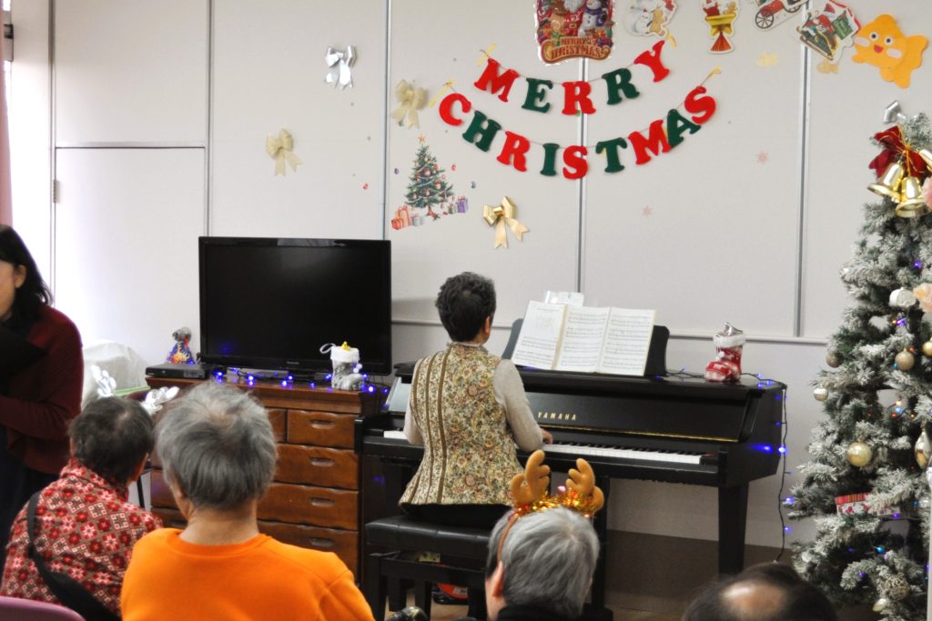 先日、事業所イベント「クリスマス会」をおこないました。今年もボランティアの方をお招きし、ご利用者のみなさんにピアノの生演奏と生歌を披露していただきました。ご利用者によっては途中でたちあがってルンルンとリズミカルに踊る方、歌に染みいる方など、みなさんの堪能される姿がありました。